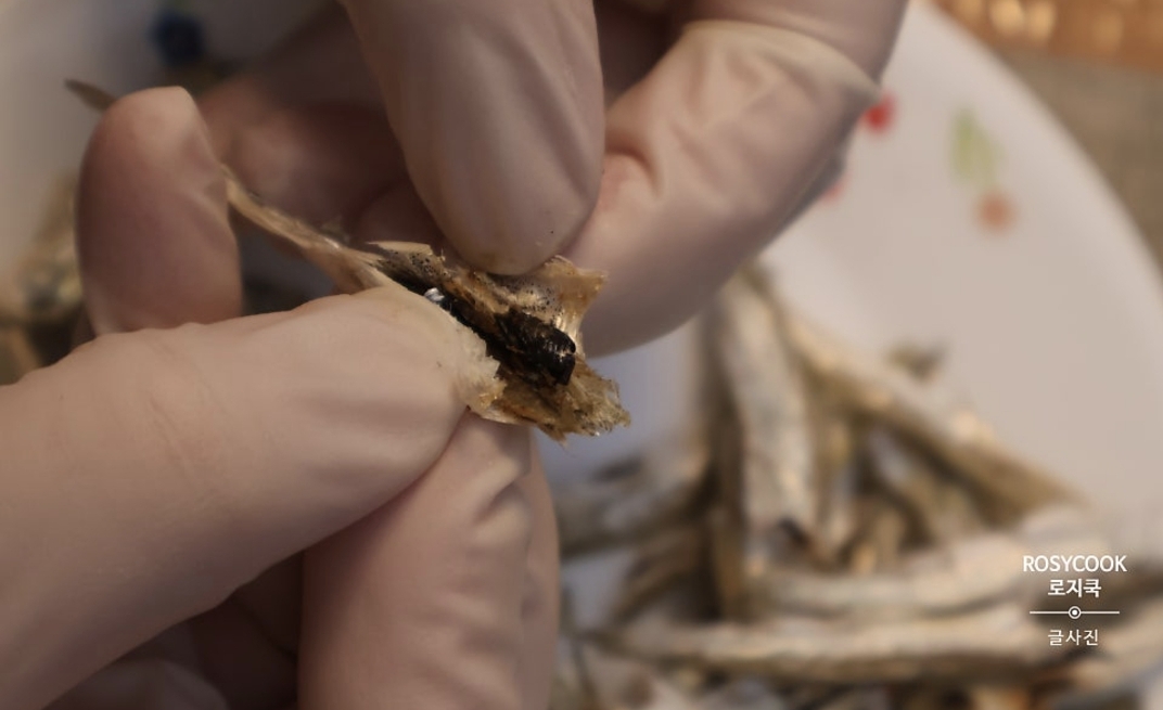 멸치 머리를 뚝 따준 후, 배를 갈라주시면 검은색의 내장이 나올 겁니다. 그걸 제거해 주시면 됩니다.
