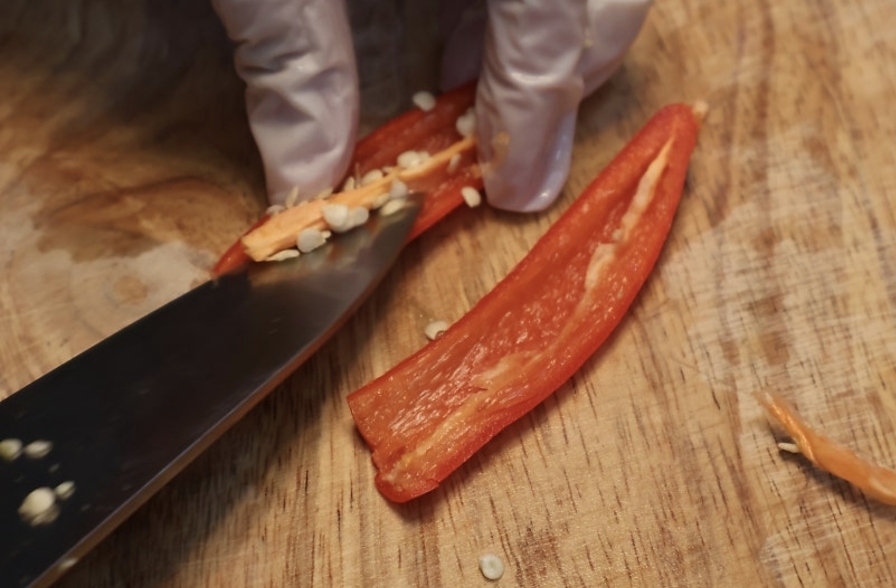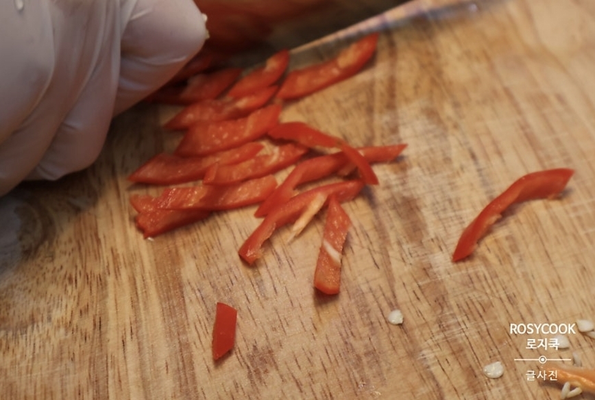 4. 홍고추 2개도 갈라준 후, 씨를 제거하고 채 썰어줍니다.