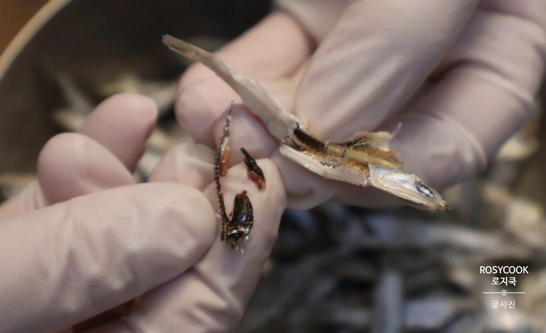 멸치 머리를 뚝 따준 후, 배를 갈라주시면 검은색의 내장이 나올 겁니다. 그걸 제거해 주시면 됩니다.