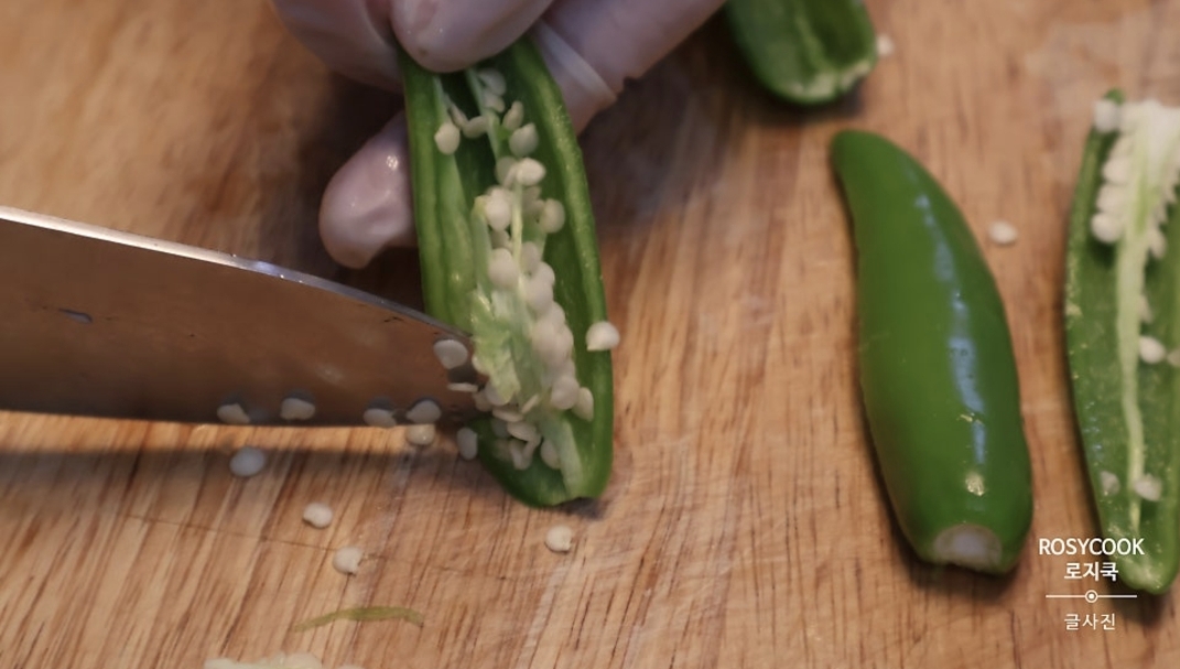 3. 청양고추 4개를 갈라준 후, 씨를 제거해 주시고 채 썰어줍니다.