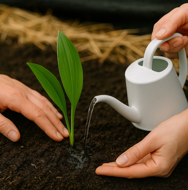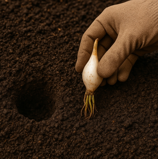 비늘줄기를 심을 때는 10cm 정도의 간격을 두고 깊이 약 5~7cm 정도로 구멍을 파고 뿌리를 똑바로 세워 심습니다. 이후 흙을 부드럽게 덮고 살짝 눌러 고정한 후, 물을 충분히 주어 흙과 뿌리가 밀착되도록 합니다.