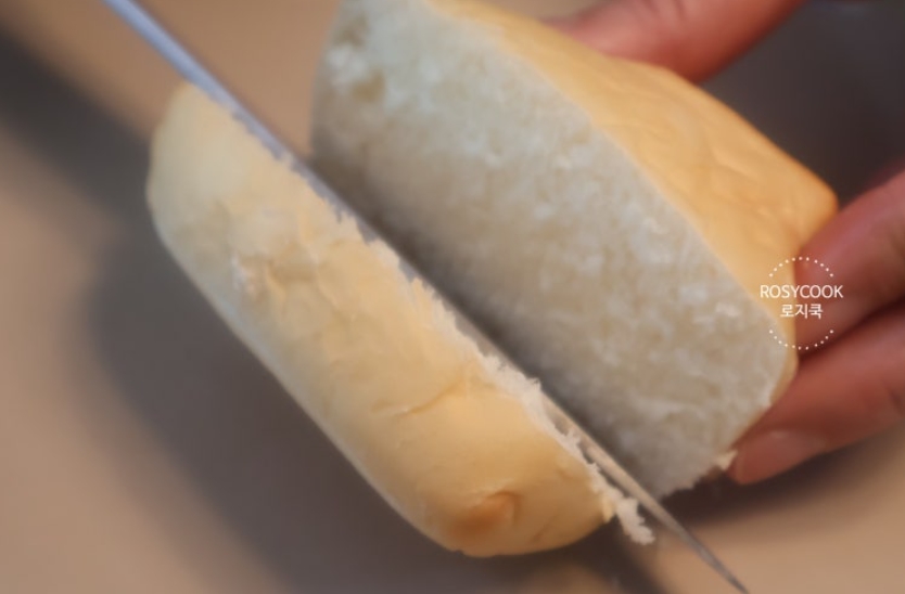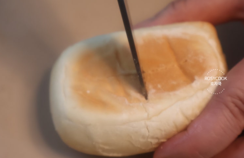 6. 모닝빵을 사각형으로 파줍니다. 칼을 사용해서 파주시면 되고요. 끝까지 파지 마시고 바닥은 어느정도 남기도 파주세요.