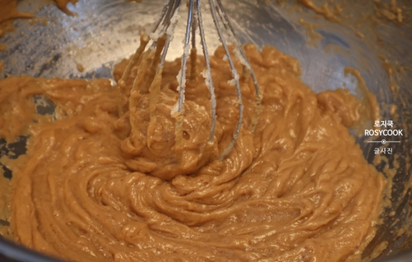5. 전분가루를 넣어서 잘 풀어줍니다. 전동 휘핑기를 사용하면 쉽게 풀 수 있습니다.