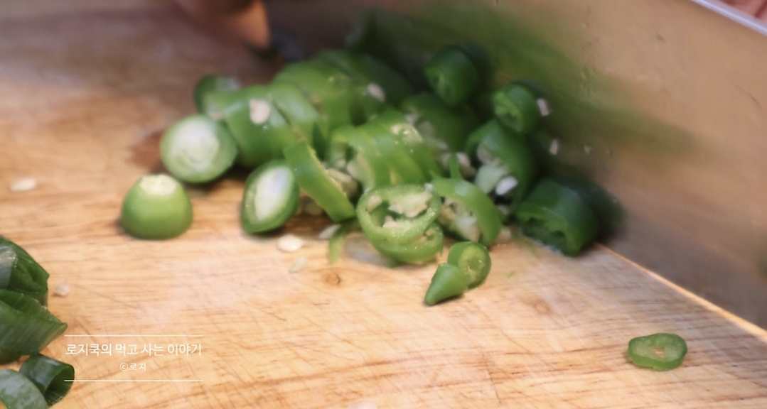 가는 파는 송송 썰어 향을 살리고 청양고추는 칼칼함을 더해주기 위해 송송 썰어 준비해요.