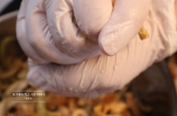 7. 불려둔 무말랭이의 물기를 꽉 짠 후, 만든 무말랭이무침 양념에 넣어줍니다.