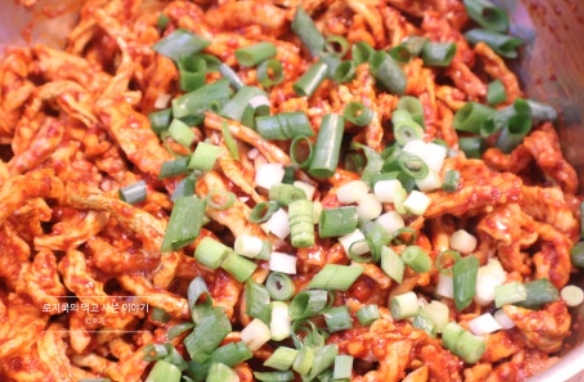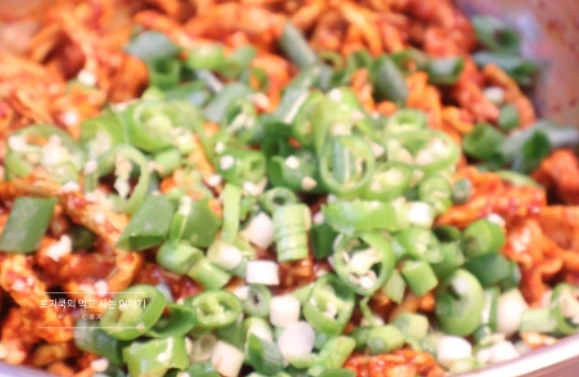 10. 다시 조물조물 무쳐준 후, 썰어둔 파와 청양고추를 넣어줍니다.