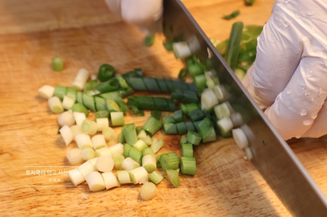 2. 가는 파를 송송 썰어줍니다. 대파를 사용하실 분들은 1대 정도 송송 썰어주시면 됩니다.