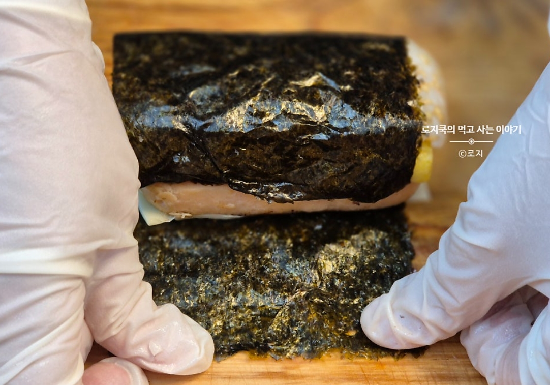 16. 랩에서 꺼내 준 후, 김 위에 올려줍니다.