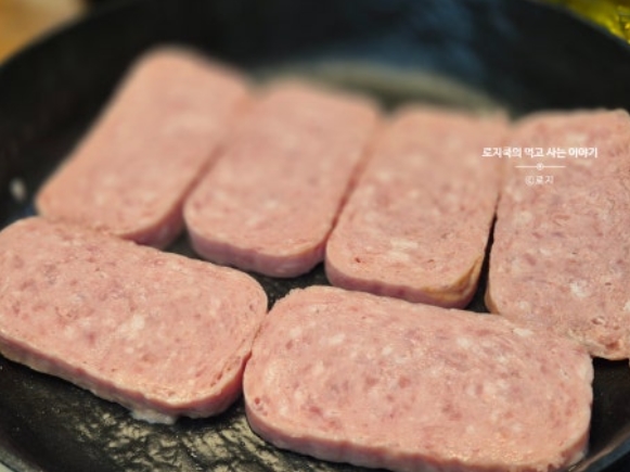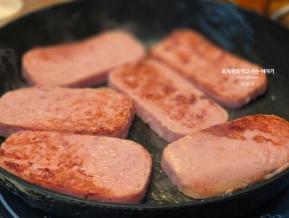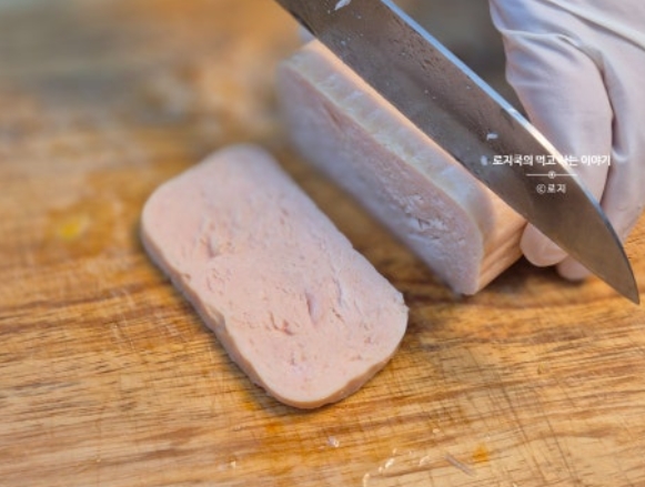 4. 닭가슴살 스팸과 일반스팸 두 가지를 사용해봤습니다. 적당한 두께로 썰어줍니다.