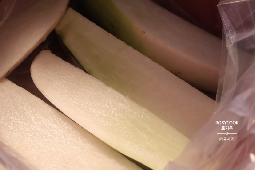 3. 김치통에 김장 비닐을 깔아주시고, 썬 무를 채워서 올려줍니다.