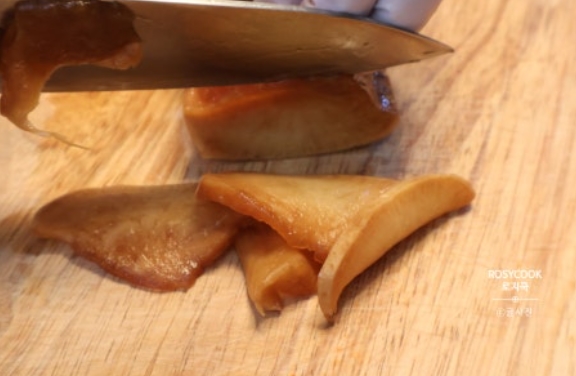 12. 드실 만큼 무장아찌를 적당한 두께로 썰어줍니다.