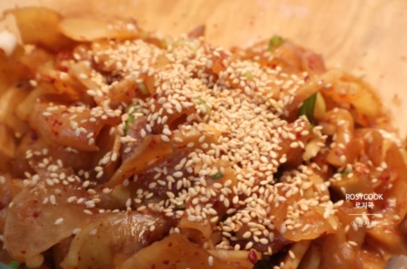 17. 깨를 전체적으로 뿌려준 후, 참기름을 둘러 마무리 해줍니다.