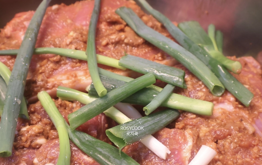 9. 준비해둔 돼지 앞다리살을 그 위에 올리고, 대파를 올려줍니다.