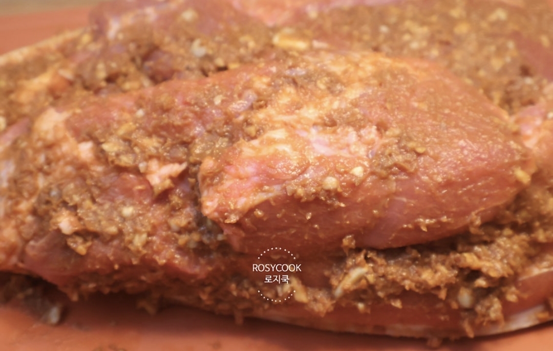 4. 앞다리살 1894g을 골고루 발라줍니다. 1 ~ 2시간 전에 미리 발라두고 양념이 밸 때까지 두면 더 좋습니다. ​