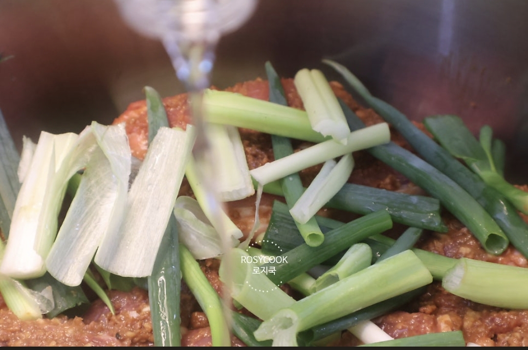 9. 준비해둔 돼지 앞다리살을 그 위에 올리고, 대파를 올려줍니다.