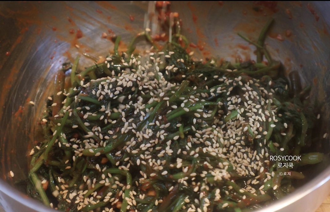 10. 참기름 1 큰 술을 둘러주시고, 깨를 전체적으로 뿌려줍니다.