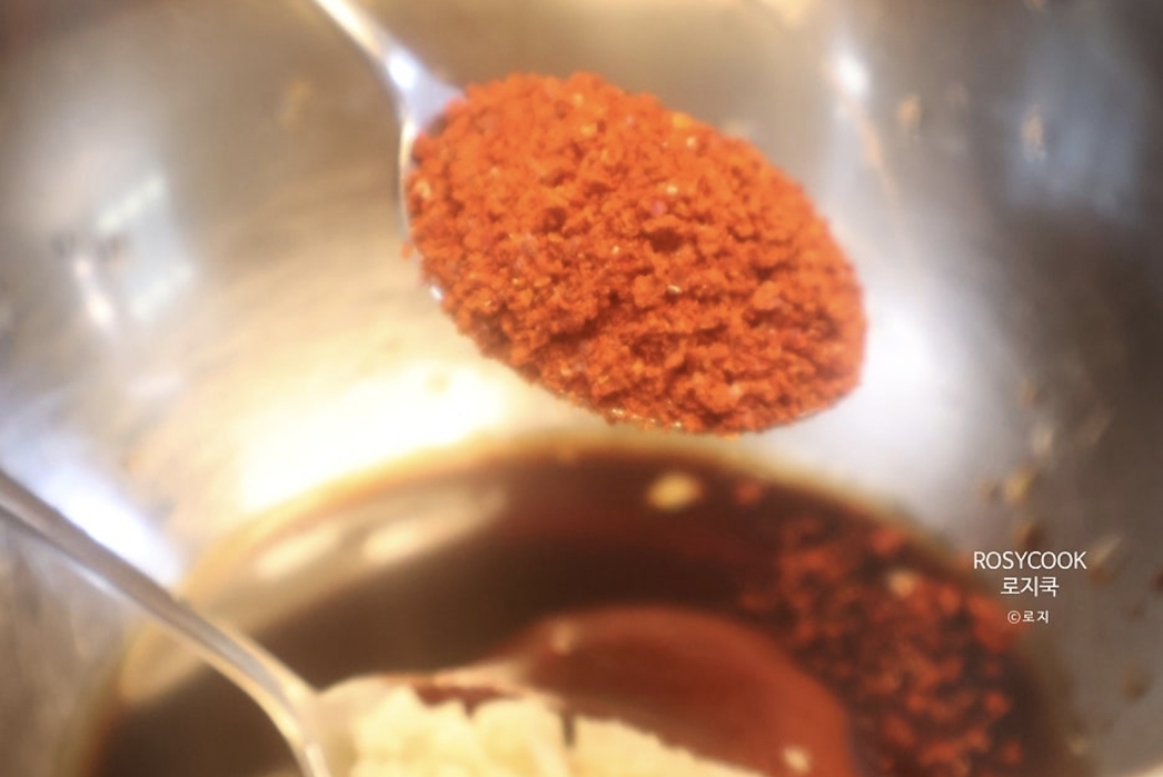 8. 간 마늘 1 큰 술, 고춧가루 2 큰 술을 넣고 잘 섞어줍니다.