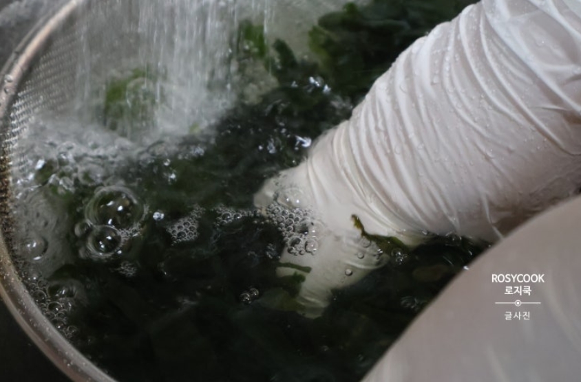 6. 불려둔 미역의 물기를 꽉 잔 후, 먹기 좋게 썰어줍니다.