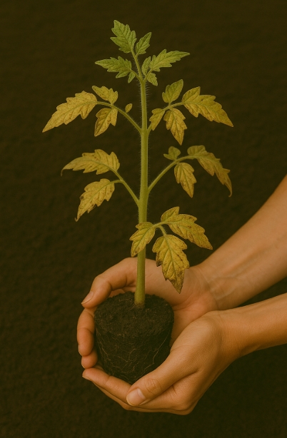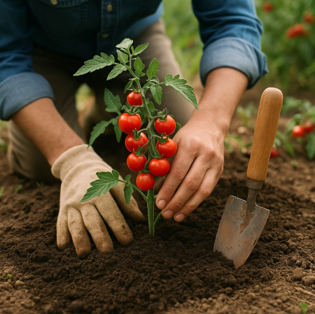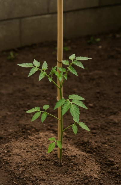 - 흙을 살짝 파서 모종을 뿌리까지 푹 심습니다. 토마토는 줄기 부분에서도 뿌리가 나와 더 튼튼하게 자라기 때문에, 약간 깊게 심는 것이 포인트입니다.