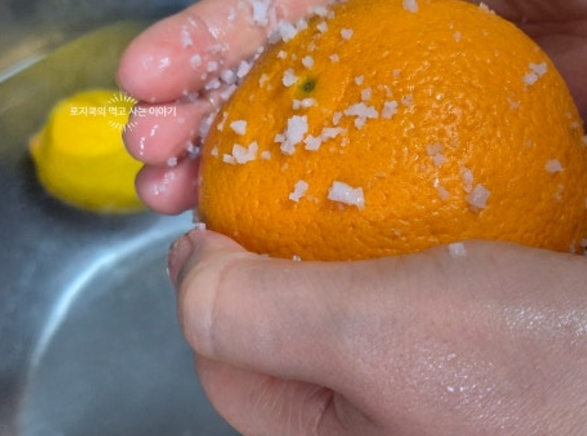 1. 오렌지 1개와 레몬 1개를 굵은 소금으로 박박 문질러 줍니다.