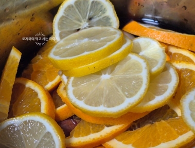 4. 오렌지와 레몬을 얇게 썰어줍니다. 레몬은 씨를 제거해줬습니다.