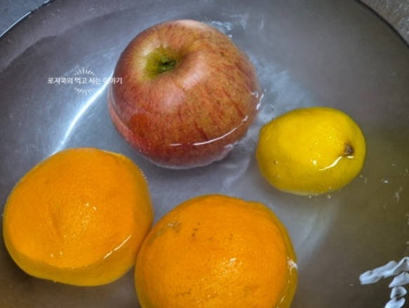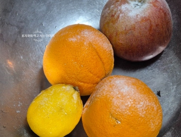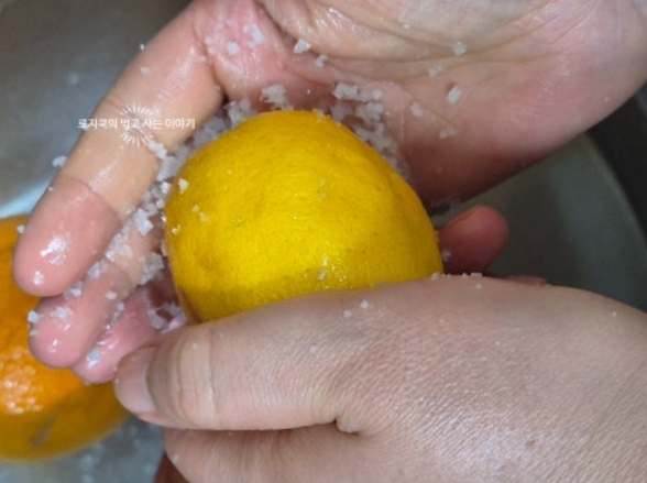 1. 오렌지 1개와 레몬 1개를 굵은 소금으로 박박 문질러 줍니다.