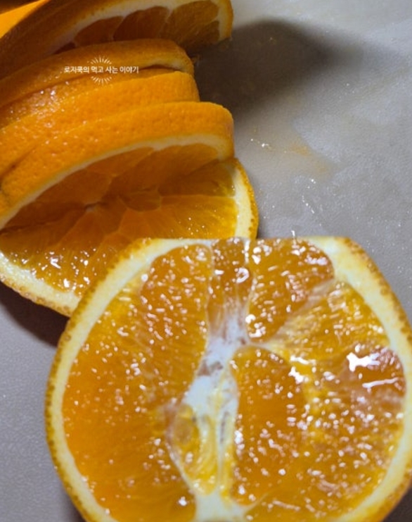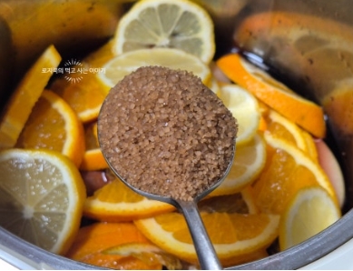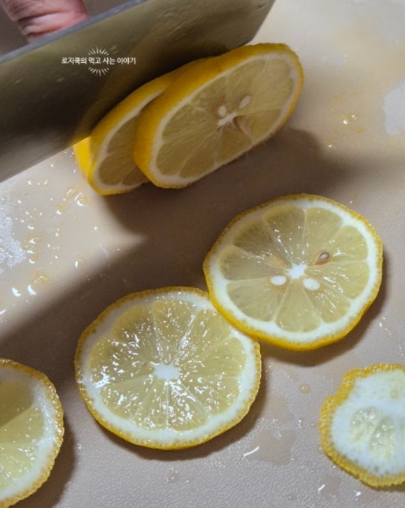 4. 오렌지와 레몬을 얇게 썰어줍니다. 레몬은 씨를 제거해줬습니다.