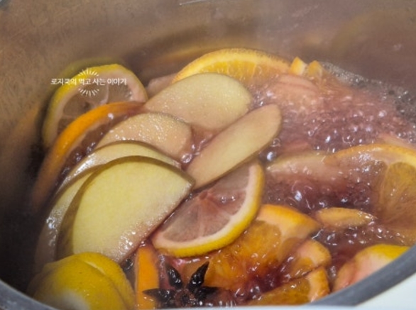 겨울 계절 메뉴로 출시되는 메뉴 중 하나죠. 크리스마스 기간에 많이 찾으시기도 하고요. 뱅쇼 뜻은 프랑스어로 따뜻한 포도주라는 뜻입니다. 포도주와 여러 과일 계피 등 향신료를 넣고 끓여 마시는 음료입니다. 유럽식 쌍화차라고 표현하기도 하는 음료로 서양에서는 감기에 좋다는 속설이 있기도 합니다. 끓이면서 알코올이 거의 날아가기 때문에 무알콜 음료에 가깝지만 끓이는 시간에 따라 약간의 알코올이 남아 있을 수는 있습니다. 그럼 뱅쇼 만드는 법 레시피 시작해 보겠습니다.