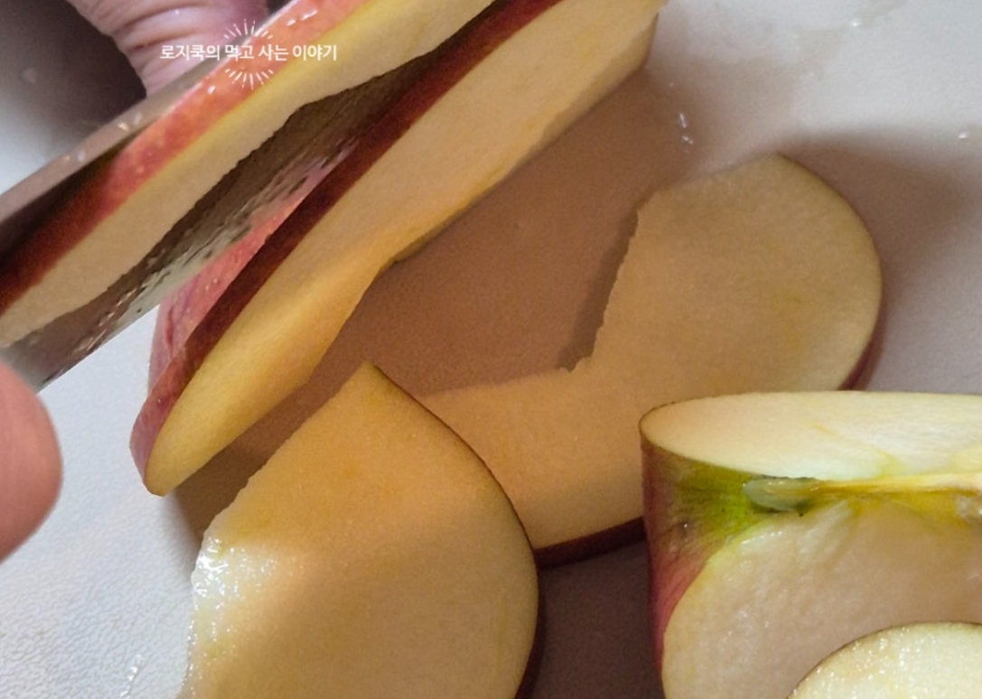 5. 사과도 4등분 한 후 씨를 제거준 후, 얇게 썰었습니다.