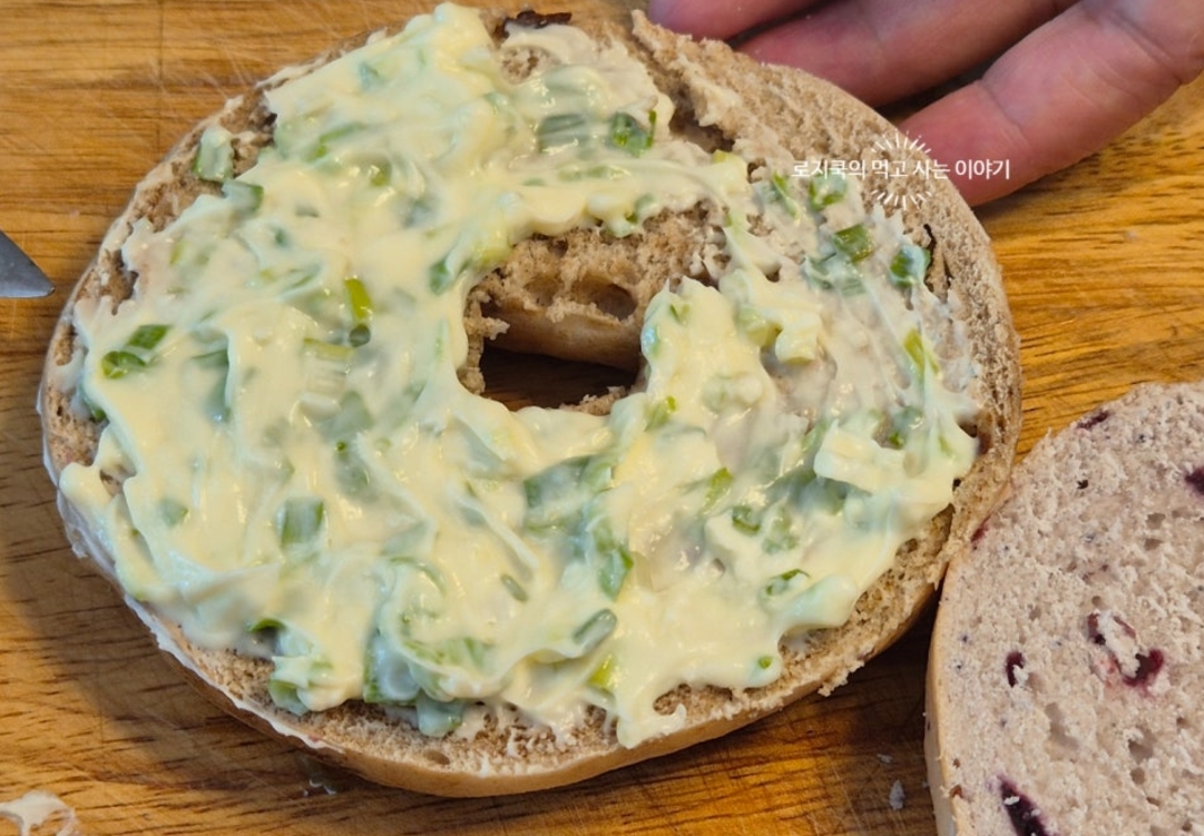 7. 쪽파 크림치즈를 베이글에 펴 벌라줍니다.