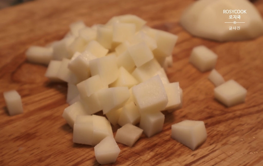 1. 감자 2개를 깍둑썰기하고 물에 담가서 전분기를 빼기 위해 10분 정도 담가둡니다.