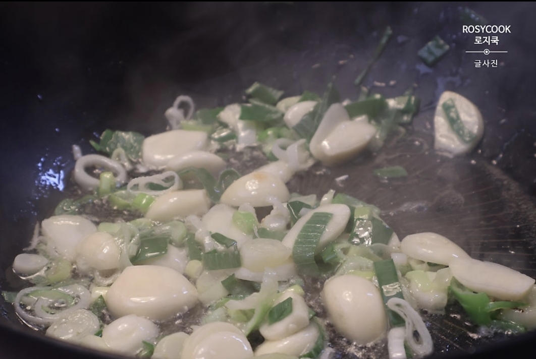 7. 파가 어느 정도 볶아졌다면 마늘을 함께 볶아줍니다.