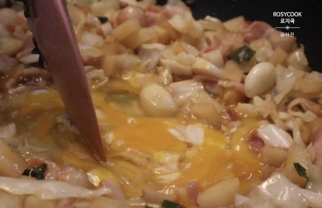 11. 계란 2알을 넣고 저어가며 스크램블 에그를 만들어줍니다.