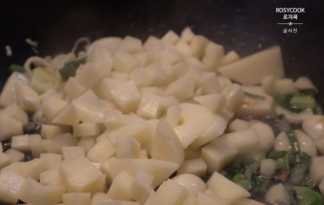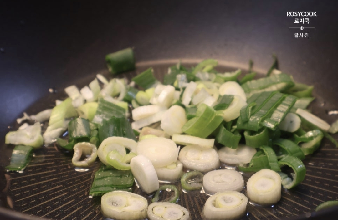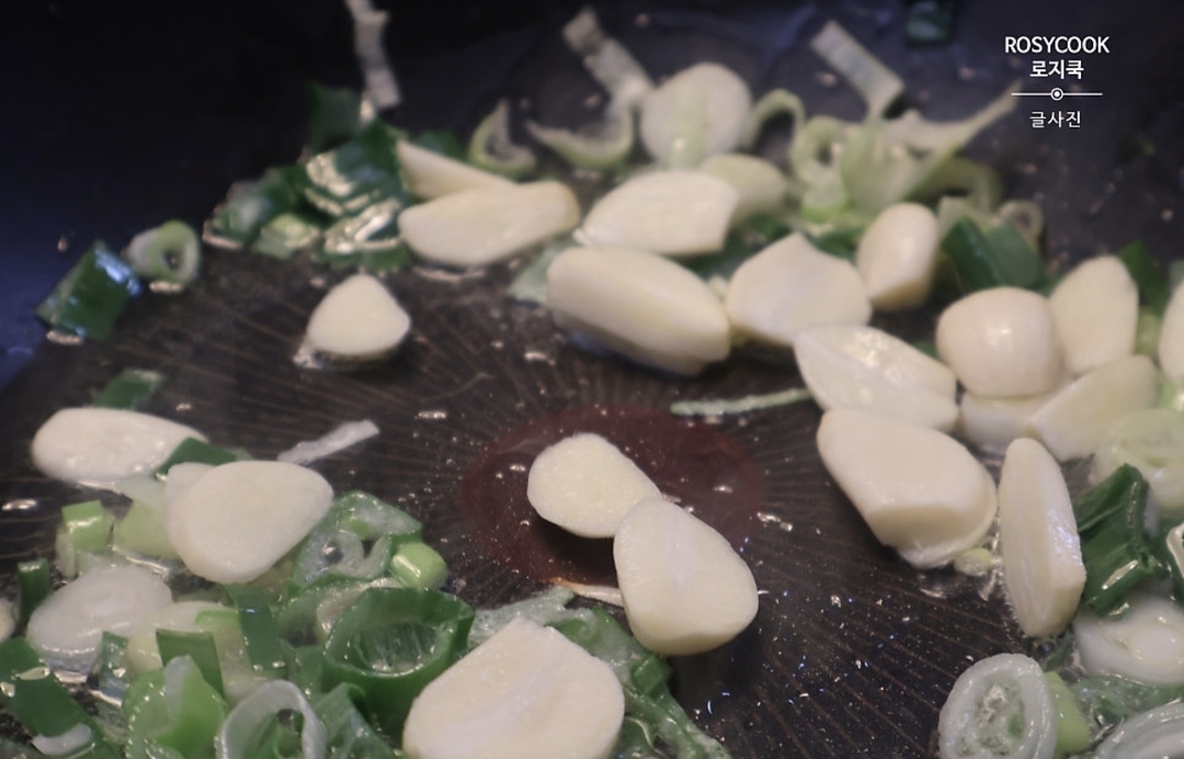 7. 파가 어느 정도 볶아졌다면 마늘을 함께 볶아줍니다.