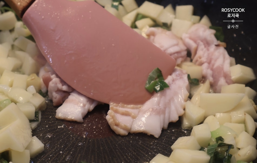 9. 감자가 어느 정도 볶아졌다면, 양배추를 넣고 볶아줍니다.