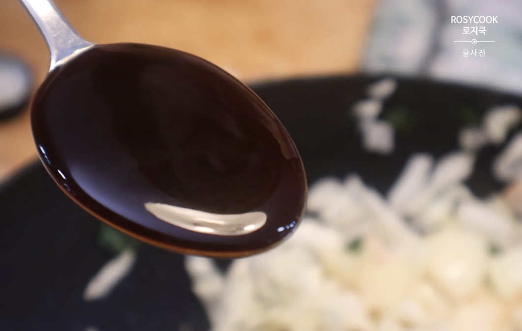 10. 재료를 잠시 밀어두고, 진간장 2 큰 술과 굴소스 1 큰 술, 설탕 1/2 큰 술을 넣고 잠시 끓여줍니다.