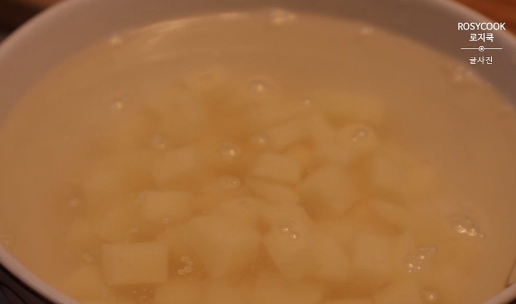 1. 감자 2개를 깍둑썰기하고 물에 담가서 전분기를 빼기 위해 10분 정도 담가둡니다.