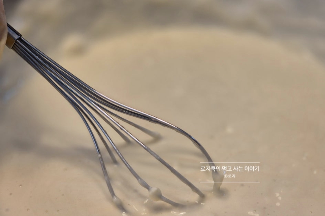 부침가루와 튀김가루를 2:1 비율로 넣고, 물 3컵을 붓고 잘 섞어주세요.