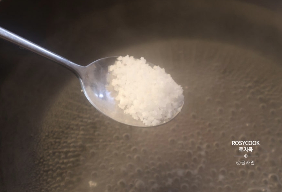 끓는 물에 소금 1/2 큰 술을 넣어주세요. 이게 나물 색을 예쁘게 살려주는 역할을 해요.