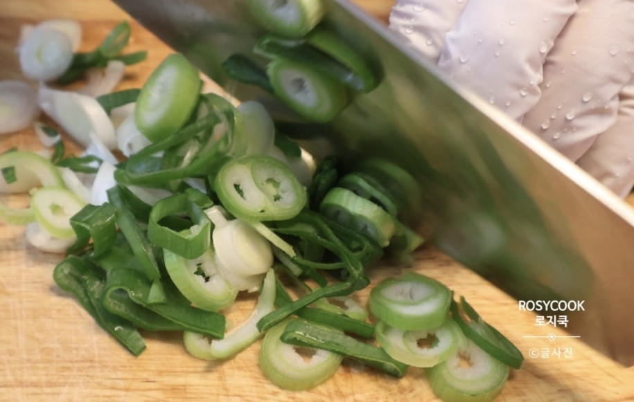 먼저 대파를 송송 썰어 준비하고, 데친 비름나물도 먹기 좋게 한두 번 썰어줍니다.