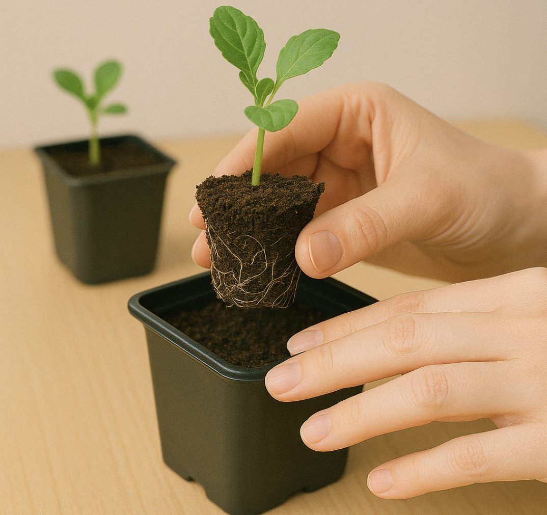 모종이 어느 정도 자라면 하나씩 포트에 옮겨 심어줍니다. 저는 분갈이할 때 뿌리가 너무 엉키지 않게 조심히 흙을 눌러 고정해줬고요.