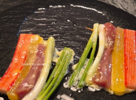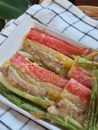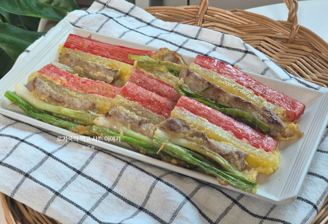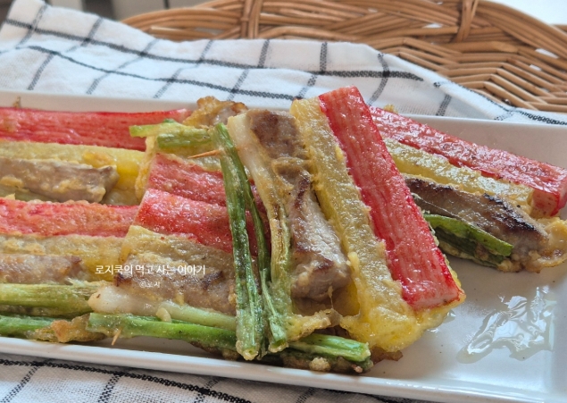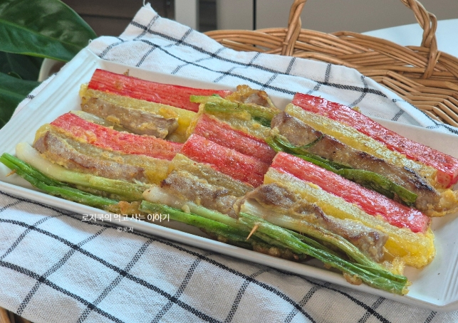 삼색꼬치전: 돼지고기 안심 + 단무지 + 게맛살 (3가지 재료)