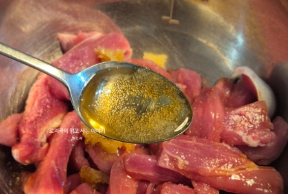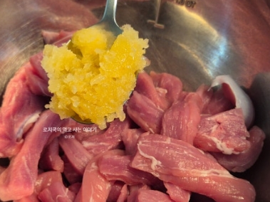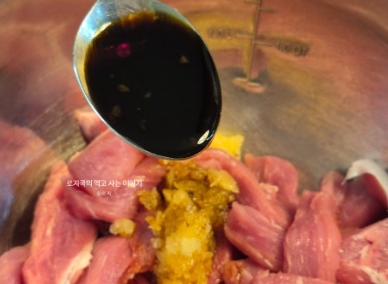 위 재료를 넣고 고기에 조물조물 밑간을 해줍니다. 밑간을 하면 잡내가 사라지고 풍미가 깊어집니다.
