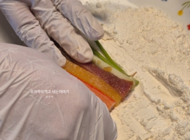 - 준비한 꼬치에 부침가루를 얇게 묻히기