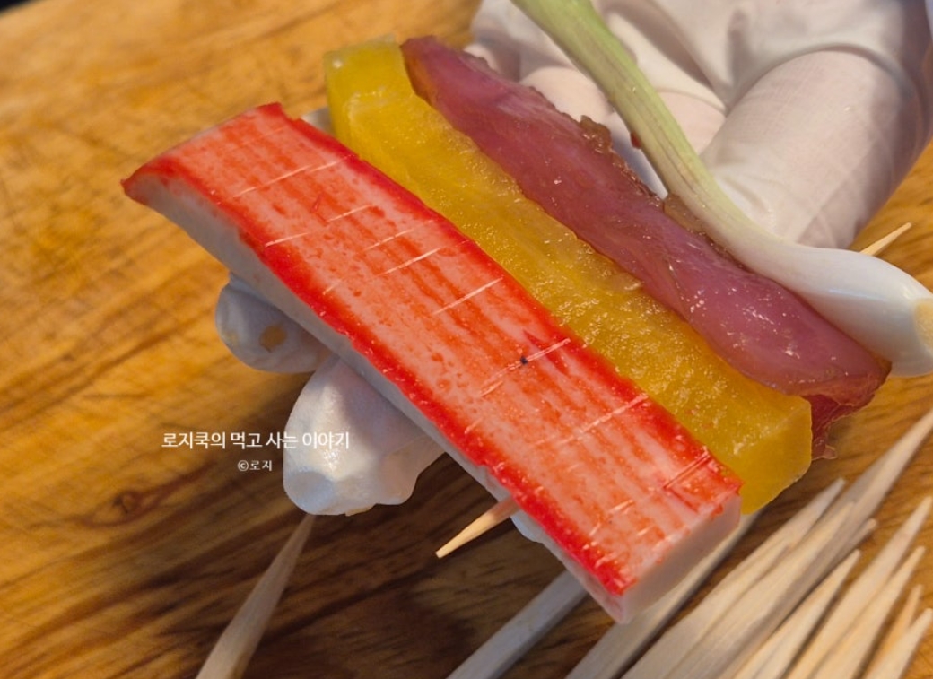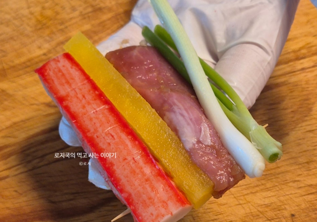 오색꼬치전: 돼지고기 안심 + 단무지 + 게맛살 + 쪽파 + 파프리카 (5가지 재료)