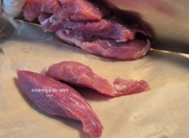 돼지고기 안심을 적당한 두께와 길이로 썰어줍니다. 다른 재료와 길이를 맞추면 보기 좋습니다.