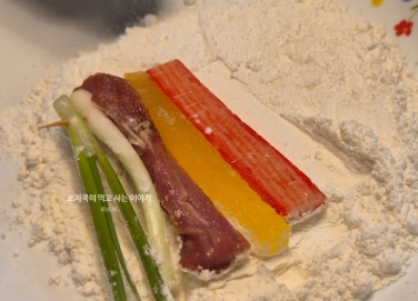- 준비한 꼬치에 부침가루를 얇게 묻히기