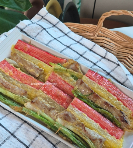 냉장고에 있는 재료를 활용해 버섯, 파프리카, 피망 등을 넣으면 훌륭한 오색꼬치전이 됩니다.
