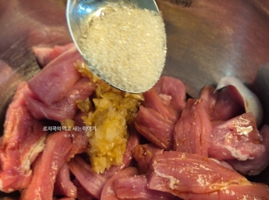 위 재료를 넣고 고기에 조물조물 밑간을 해줍니다. 밑간을 하면 잡내가 사라지고 풍미가 깊어집니다.