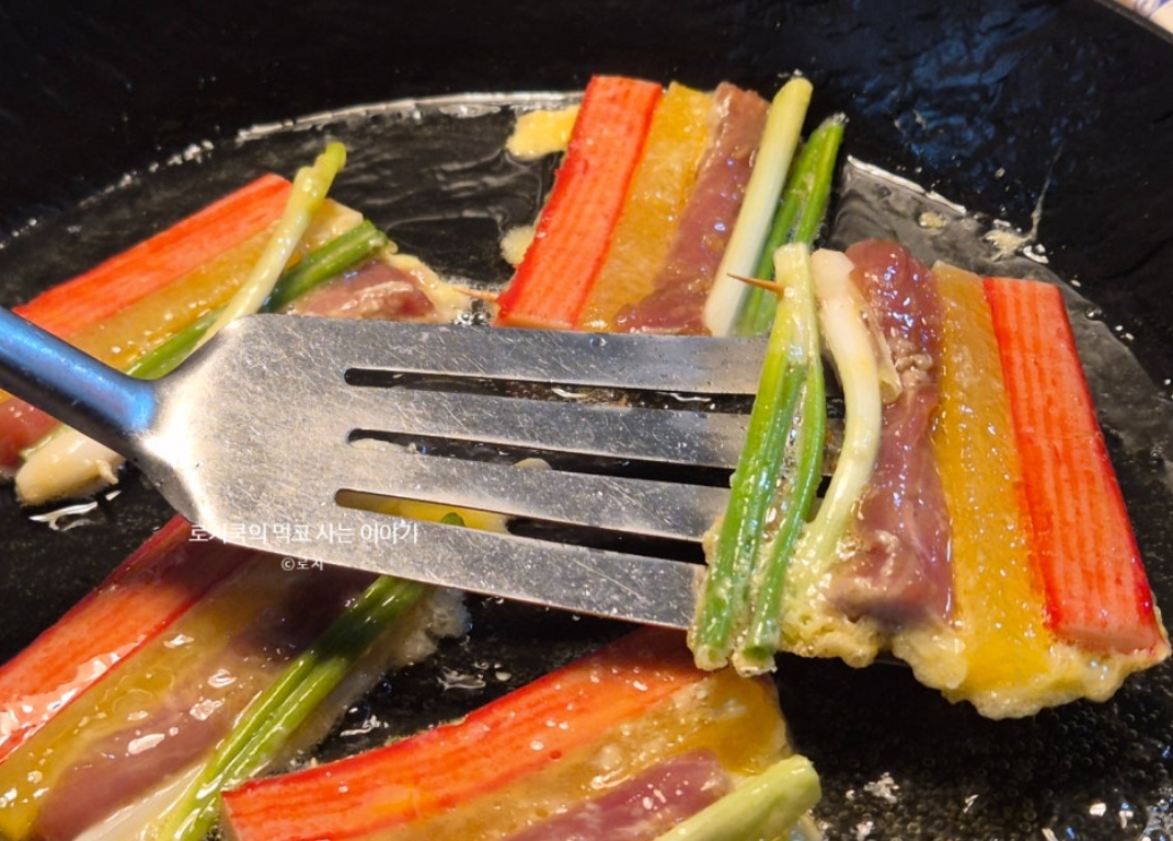 - 예열된 팬에 기름을 두르고 계란물을 입힌 꼬치를 올리기